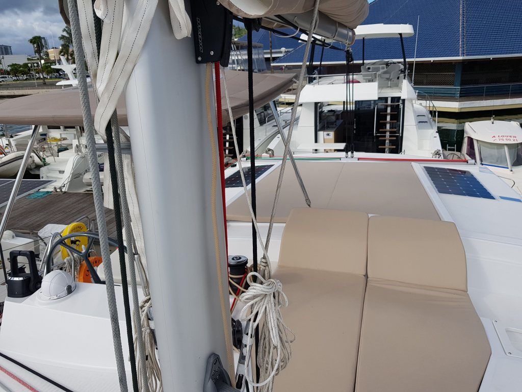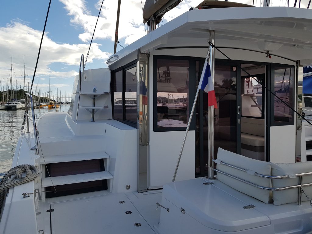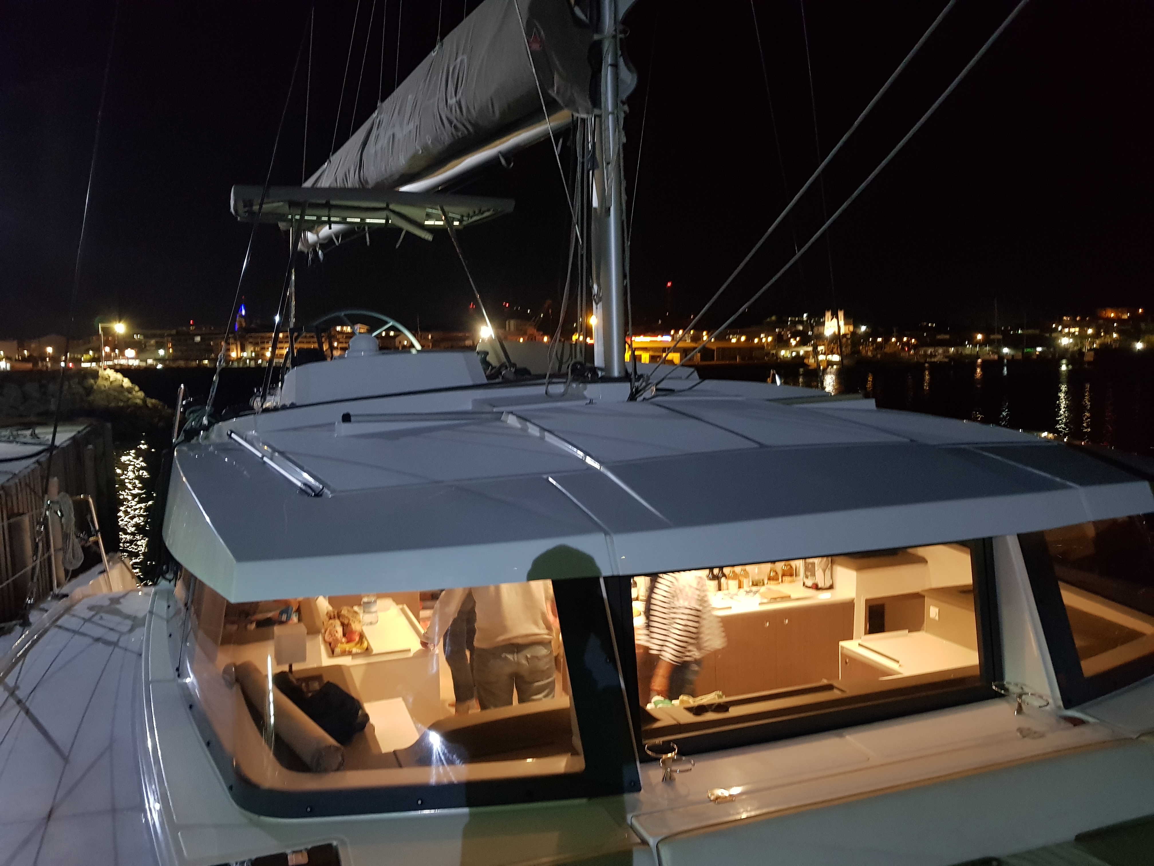 Arrivés au port, on nous fait visiter le bateau : super grand, tout blanc, tout blinquant, maxi salon, maxi cuisine, deux coins terrasse, des transats incorporés dans la coque…un truc d’américain quoi… !