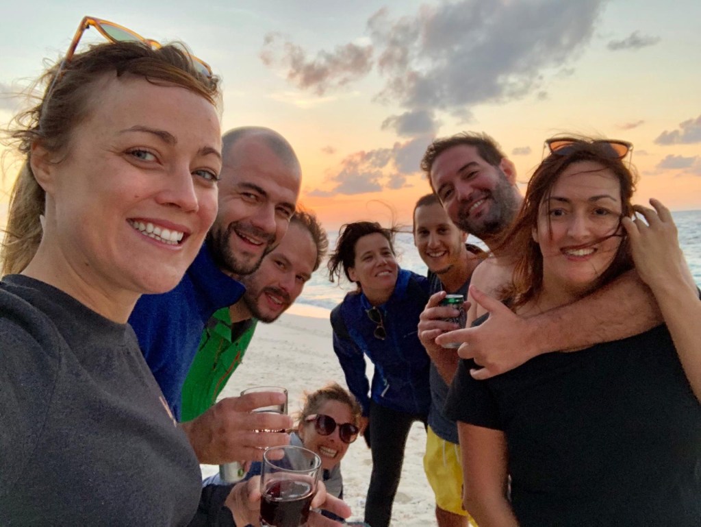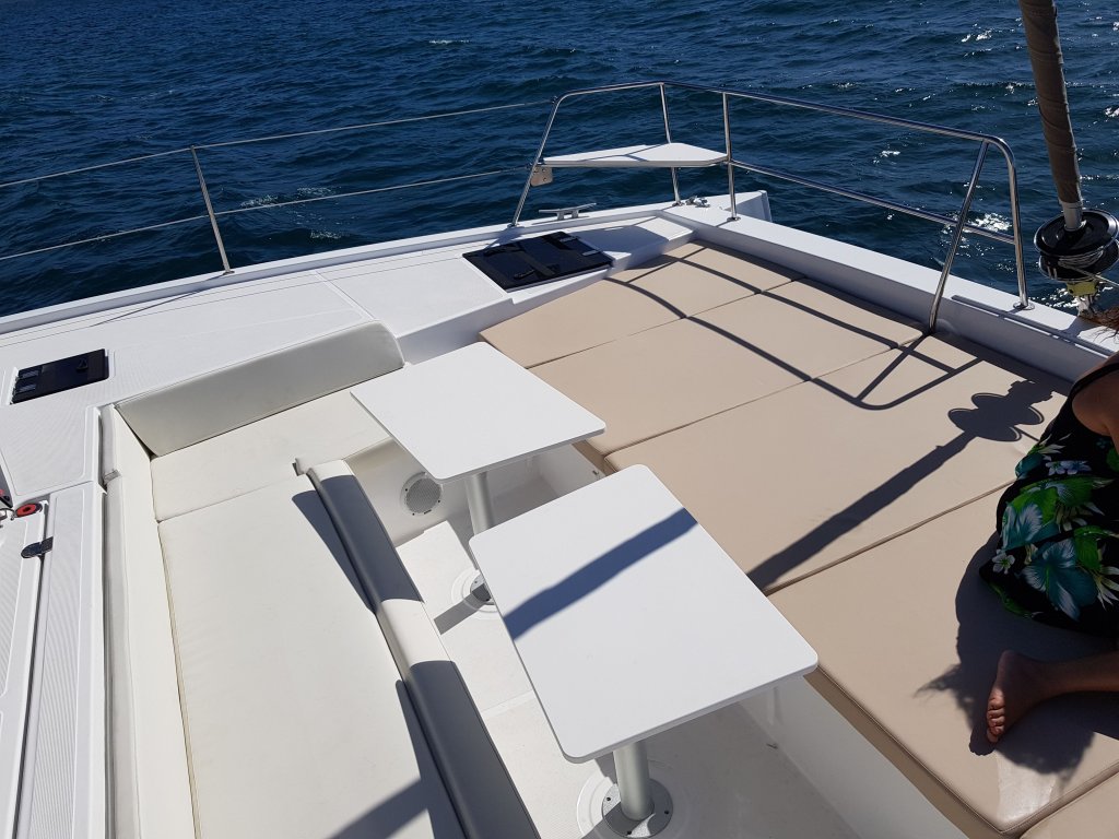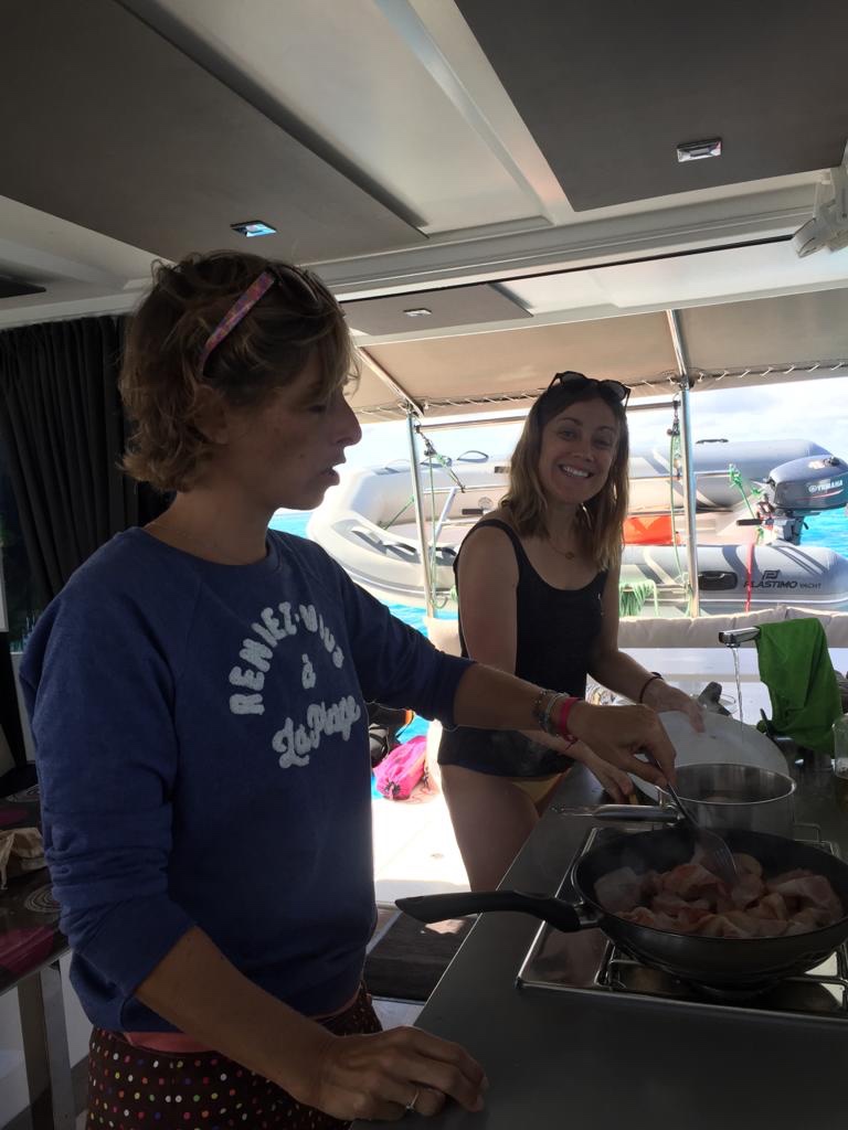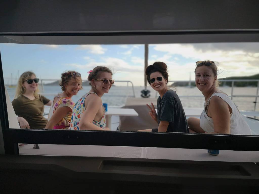 Le cata était prévu de base pour 12 personnes, nous étions 10. Le confort était de mise. Cela dit, le bateau était tellement neuf que dans les pointes (couchages individuels), il y était impossible de dormir tant cela sentait encore la résine. Du coup, certaines se sont fait 2 nuits à la belle étoile pour se réveiller avec le lever du soleil. Franchement, qui dit mieux ?!