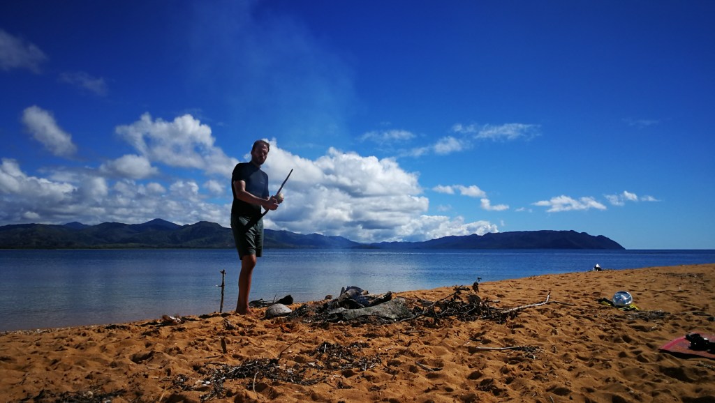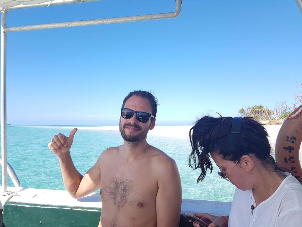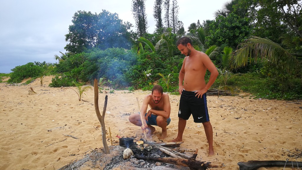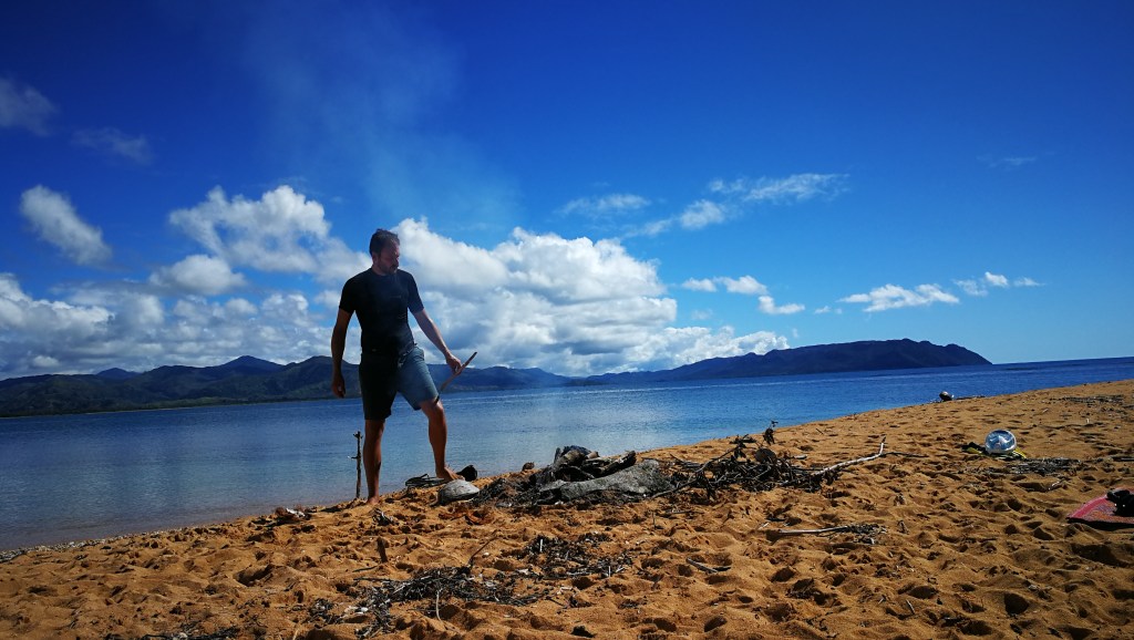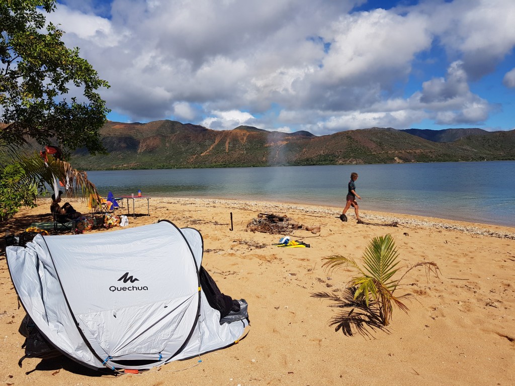 Le temps passe vite quand on s’amuse, les arrêts de 2-3 jours à gauche et à droite prennent du temps. Ça fait déjà 1 semaine qu’on bourlingue. Au programme, un premier petit îlot avec une belle langue de sable; l’ilôt Tchambouene – qui se situe à environ 30 minutes de la terre. On y passera la nuit en tente, seuls, comme perdus au bout du monde. Si ça c’est pas du luxe…