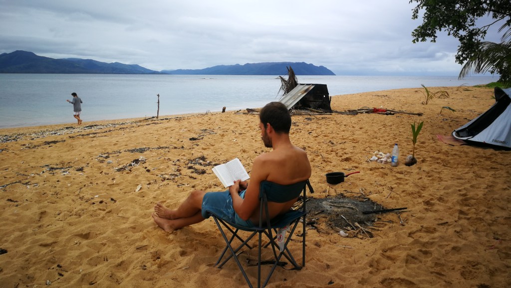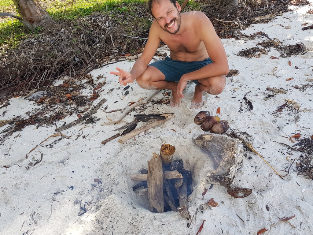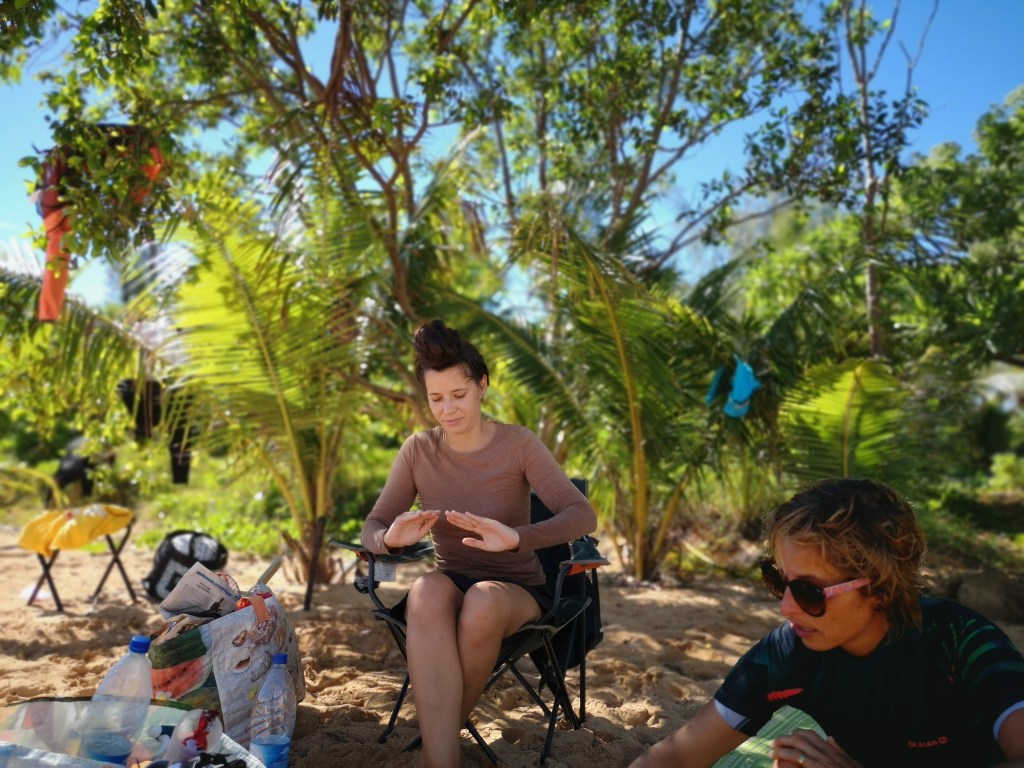 Pendant notre trip de 12 jours, sur le dernier îlot visité, Tim a perdu son alliance. Il l’avait tout bonnement retirée pour ne pas l’abîmer en coupant du bois (avec le coup’coup traditionnel) et mise dans un sac. Sauf qu’en camping, les sacs bougent et évoluent. 1h avant le départ en taxi-boat, il s’est rendu compte qu’elle n’était plus à l’endroit où il l’avait glissée. On a cherché comme des fous sans résultat…