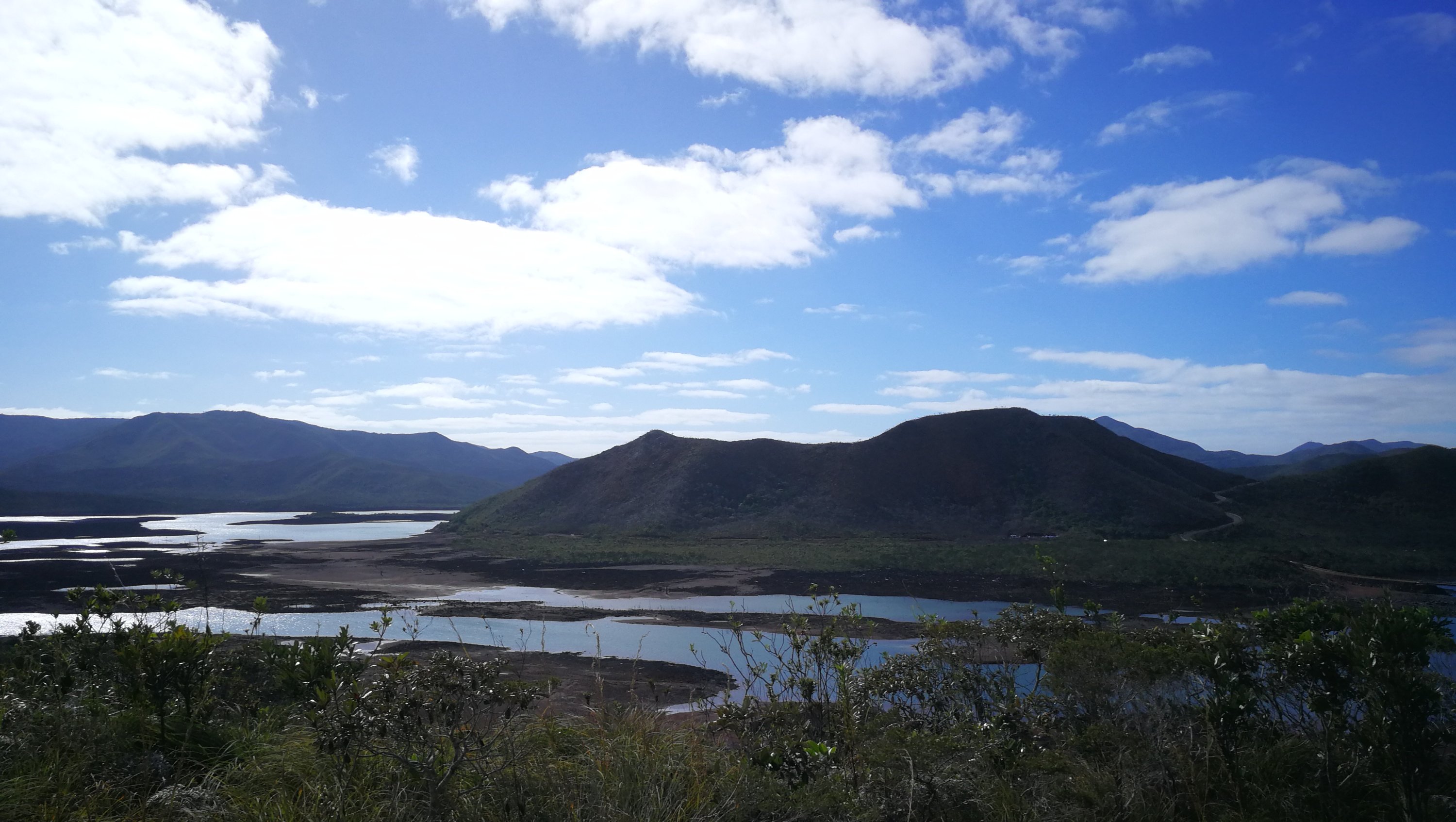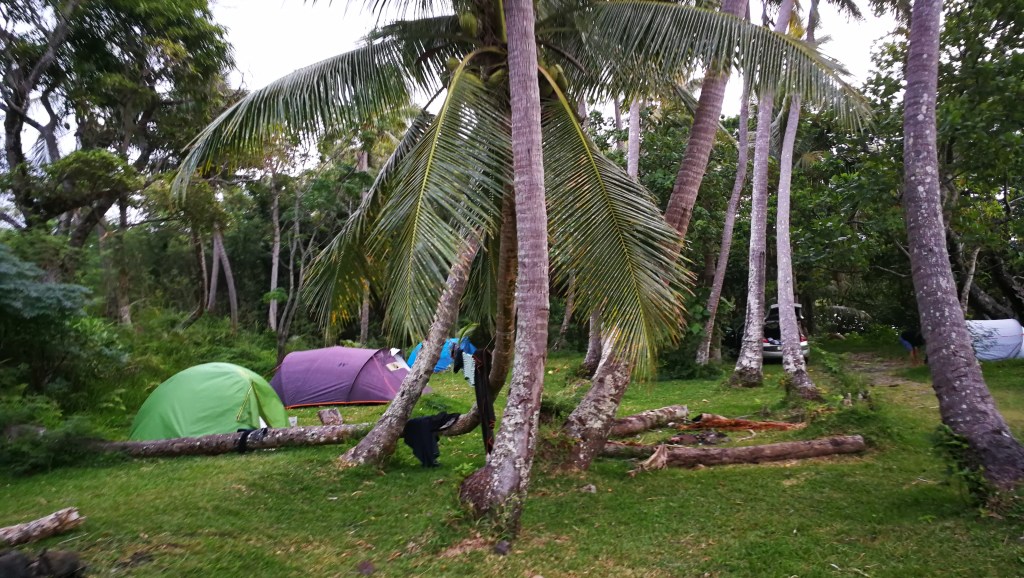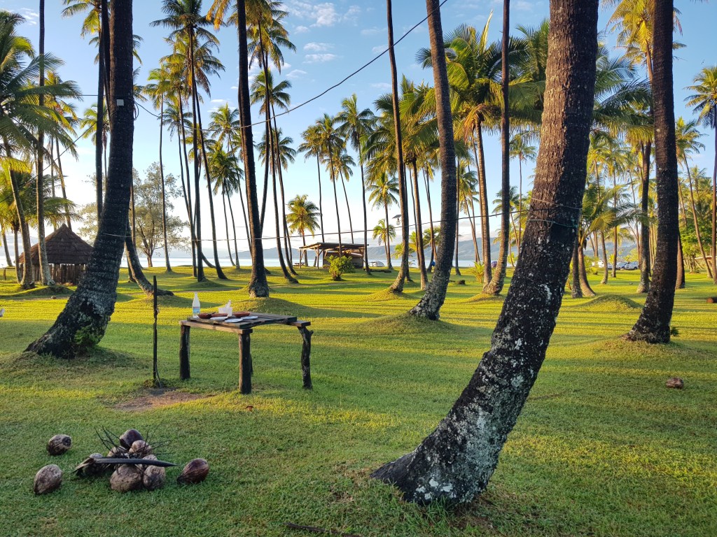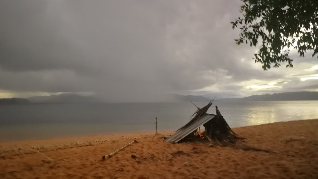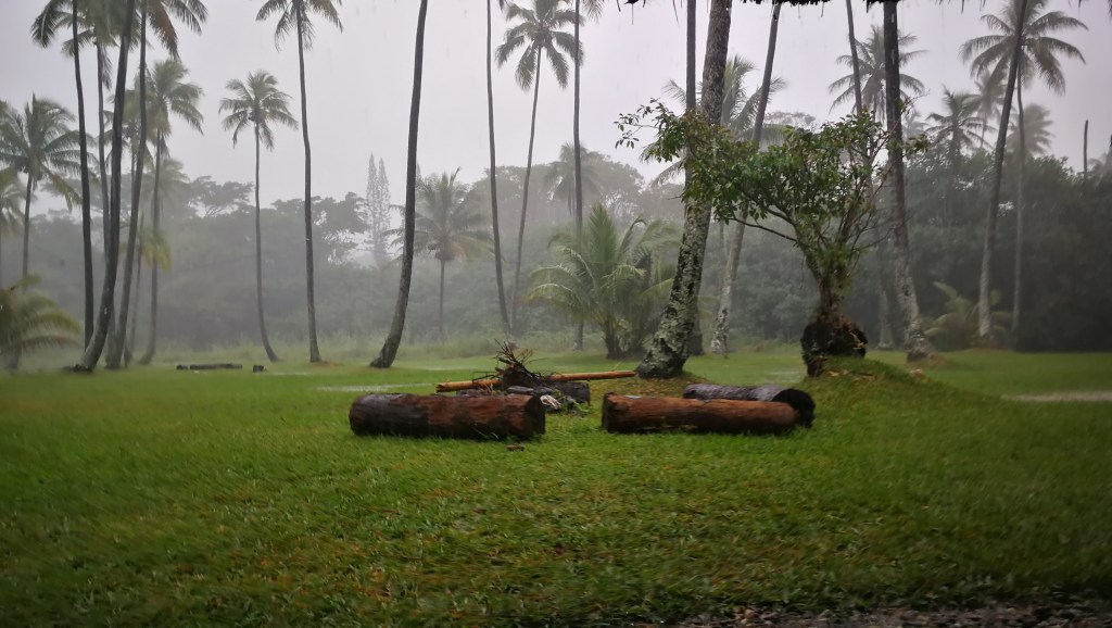 Le campement à l’écoMusée de Voh.Changement de campement mais la pluie nous poursuit …La nuit est fraîche, on se protège comme on peut de cette pluie collante. Quel brol sous le faré détrempé !!Et le lendemain matin, c’est GRAND soleil … le paysage est tout autre !Allé Alicia, mets un filtre pour voir ce que ça donne ?!