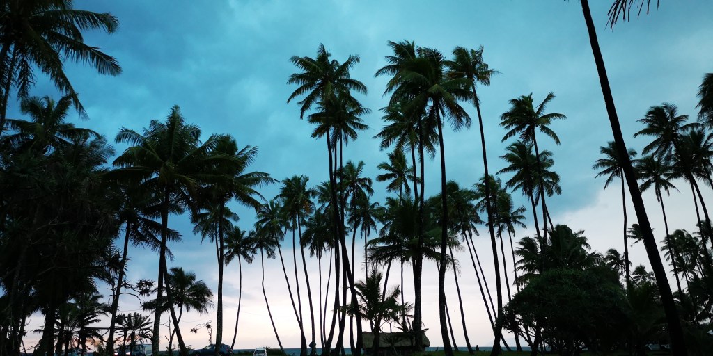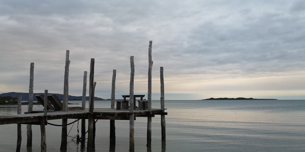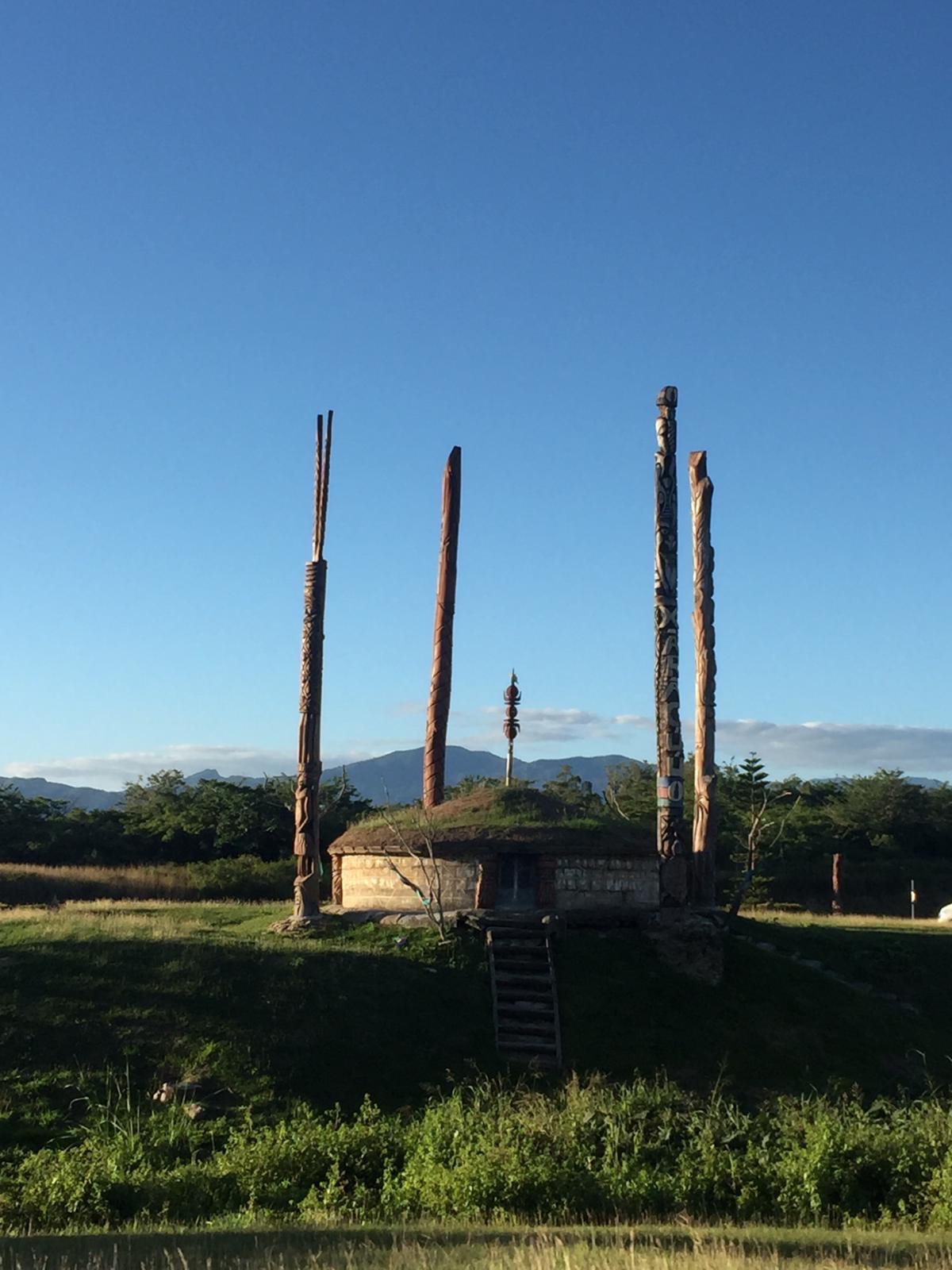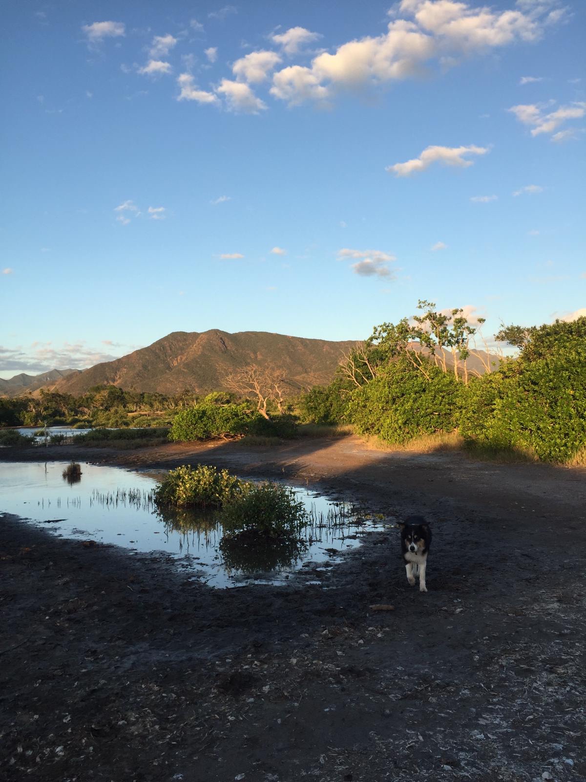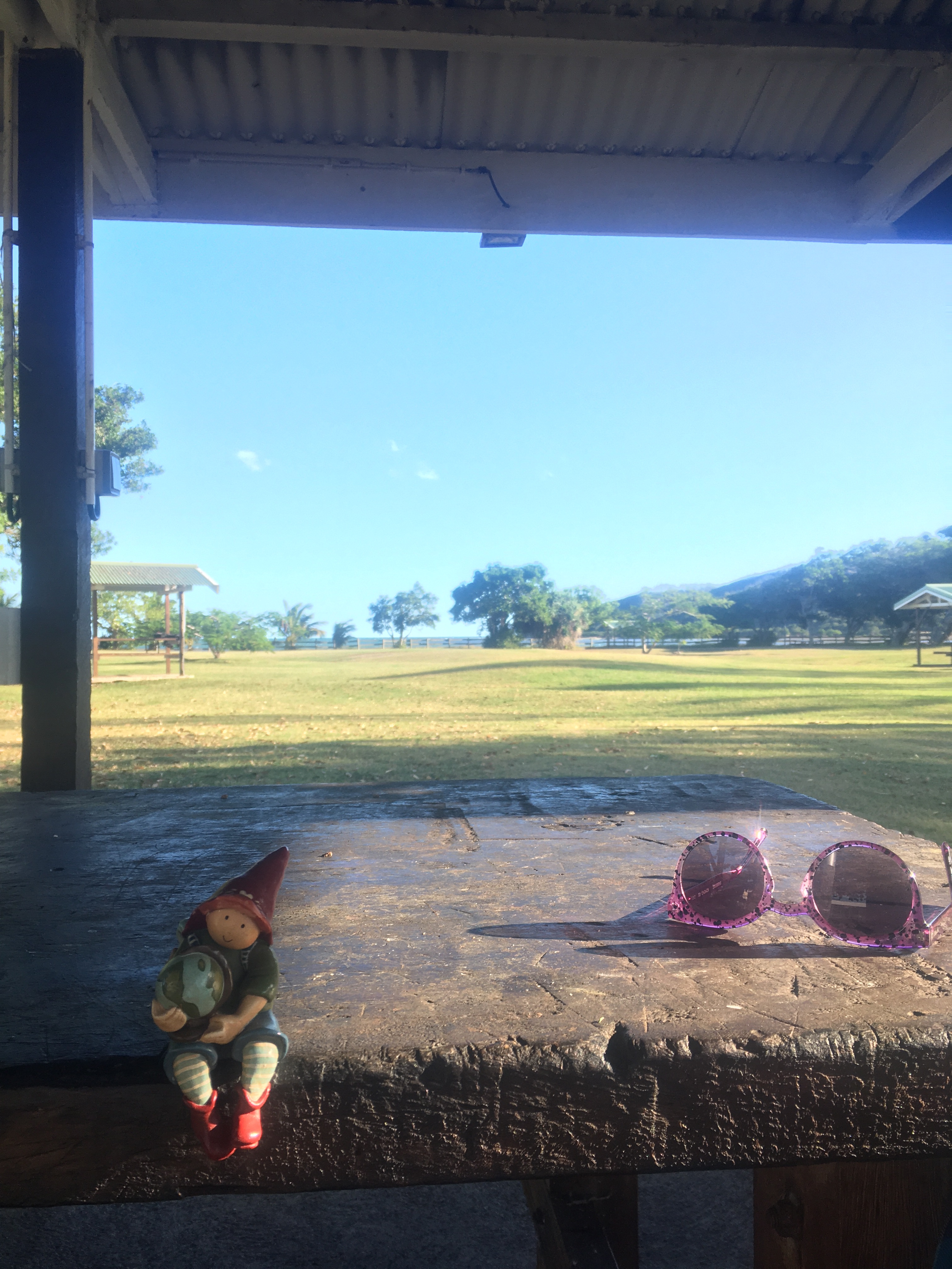 Le campement à l’écoMusée de Voh.Changement de campement mais la pluie nous poursuit …La nuit est fraîche, on se protège comme on peut de cette pluie collante. Quel brol sous le faré détrempé !!Et le lendemain matin, c’est GRAND soleil … le paysage est tout autre !Allé Alicia, mets un filtre pour voir ce que ça donne ?!