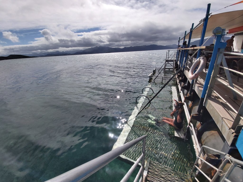 Le Ponton, c’est une plateforme resto-bar à 7 minutes de navigation de Nouméa. Il est ancré sur un fond de sable de 4,5 mètres et on peut s’y baigner ! Y a aussi un petit tunnel sous-marin pour découvrir les poissons sans mettre la tête sous l’eau.